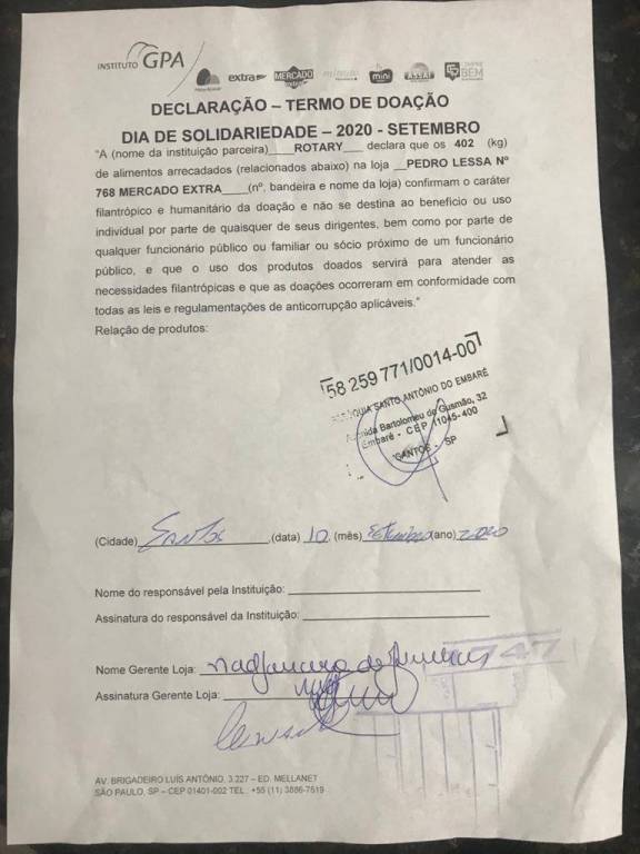 Em mais uma ação da Campanha da Solidariedade a Presidente Motivadora do Rotary Club de Santos Ponta da Praia, Véra Baldo, fez a entrega de 402kg de alimentos à Basilica Menor de Santo Antônio do Embaré.