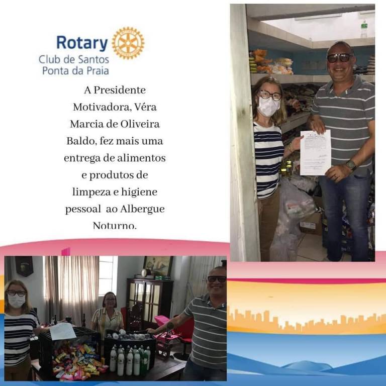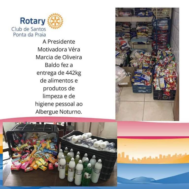 Na sexta, 18/09, a Presidente Motivadora do Rotary Club de Santos - Ponta da Praia, Véra Marcia de Oliveira Baldo, fez a entrega de 442kg de alimentos e produtos de limpeza e higiene pessoal ao Albergue Noturno.